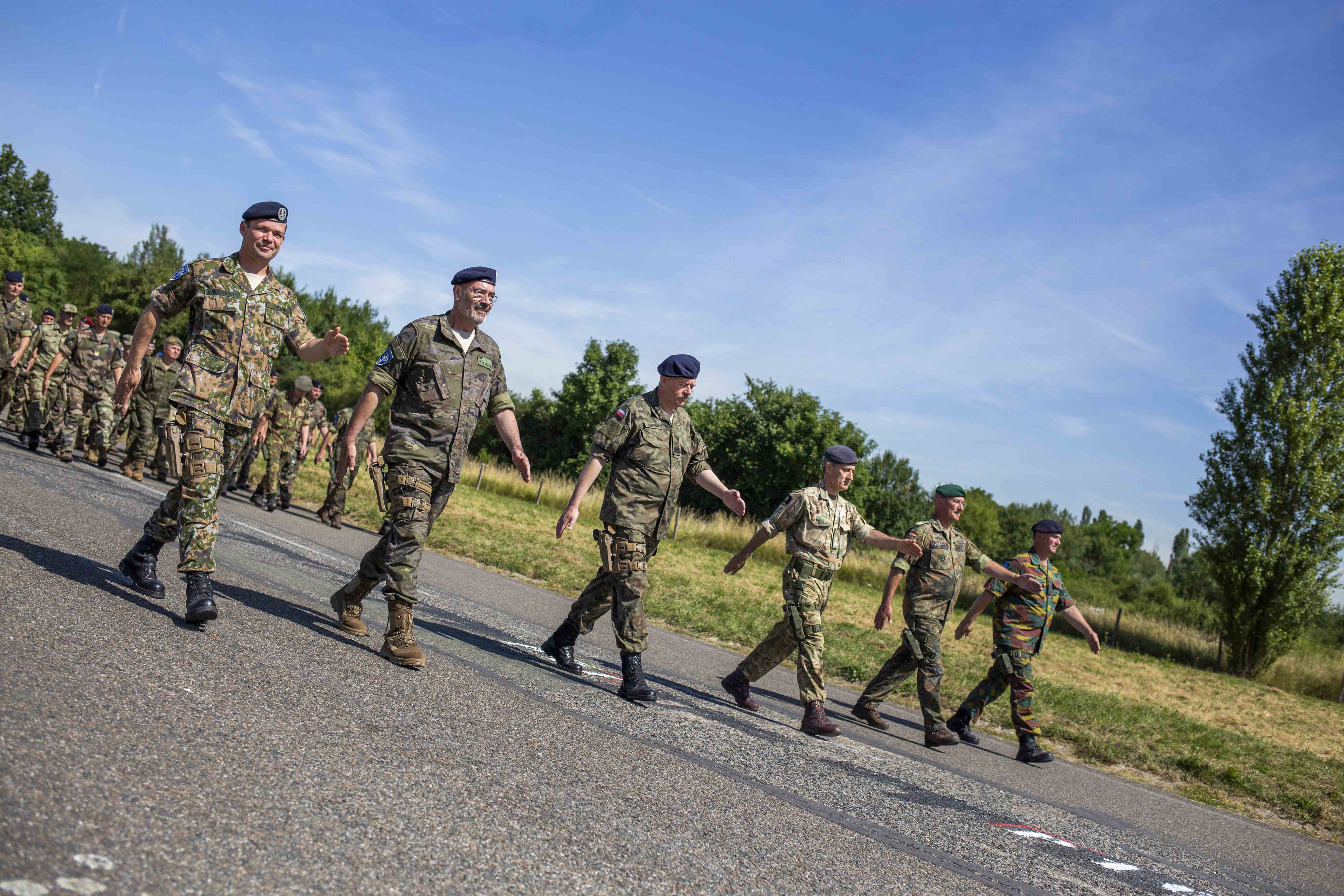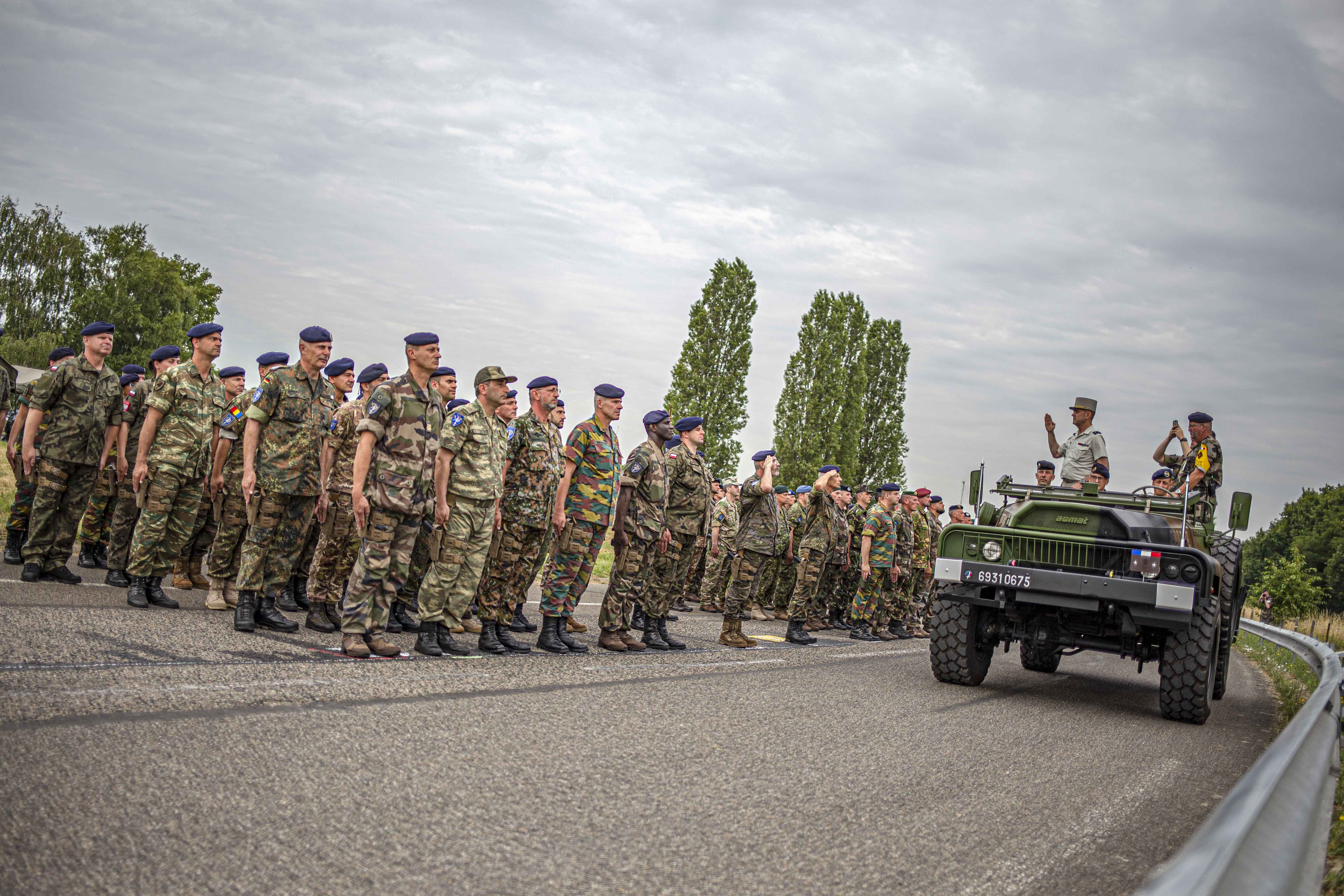 On marche au pas et on se serre les coudes – l’Eurocorps et le Corps de réaction rapide France, basé à Lille, en route pour le défilé du 14 juillet Quatre heures du matin. Au crépuscule, le silence des Champs Elysées est rompu par un convoi de plusieurs dizaines de cars et un impressionnant dispositif de la police nationale. Des milliers de militaires issus de nombreuses nations débarquent des véhicules. Il ne reste plus que cinq jours avant l’un des défilés militaires les plus importants du monde. Quelque 4 200 militaires, 196 véhicules à roues, 69 avions et 39 hélicoptères passeront sur ou au-dessus de cette magnifique avenue. Cette année, le défilé du 14 juillet sera placé sous le thème « Protégeons ensemble ». En tout, dix nations seront mises à l’honneur en tant que partenaires officiels. Parmi elles, et cela constitue pratiquement une tradition, l’Allemagne, l’Espagne et le Portugal, mais aussi des nations telles que la Finlande et la Lituanie. L’Eurocorps sera présent avec un contingent de trente-cinq militaires sous le commandement du Général commandant le Corps européen, le Général de corps d’armée Jürgen WEIGT. Le détachement a fait le déplacement dès samedi, plus d’une semaine avant l’événement, car avant de pouvoir descendre la plus belle avenue du monde, le maître mot est : entraînement. Suées garanties pour nos militaires car le soleil parisien tape déjà très fort.